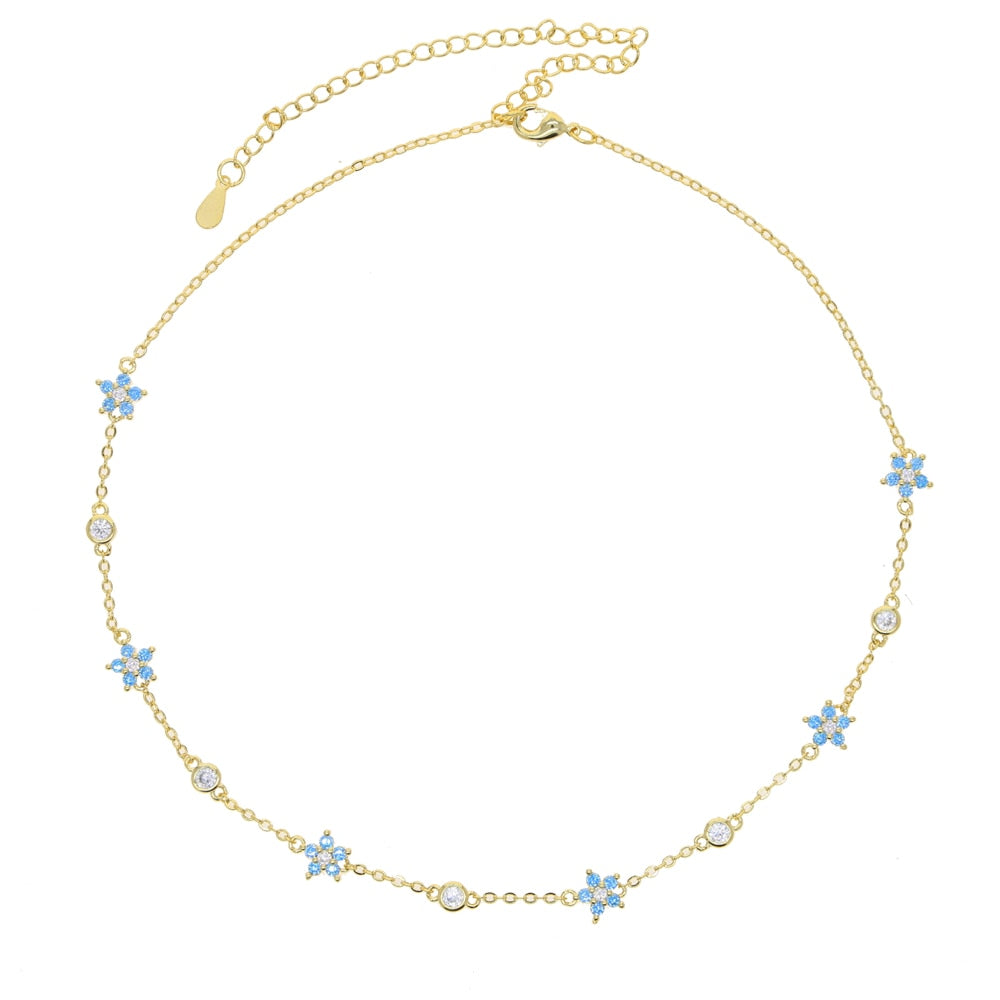Illuminate your glow. Gorgeous and chic, our Eva necklace is made with baby blue crystal flowers on gold plating - a must-have piece! For the ultimate look, pair with our beautiful Taylor Earrings.
