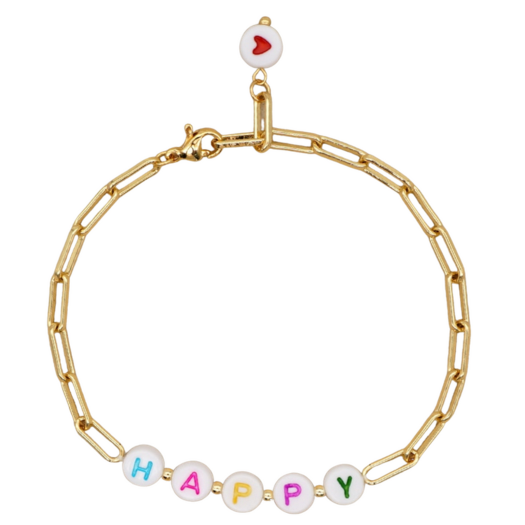 Share your happiness with our Liv Bracelet! This lively bracelet is made with gold link chain adorned with colorful beads, engraving 'HAPPY'.' Bead with a red heart embellish the lobster claw closure. A lovely must-have bracelet to inspire others!