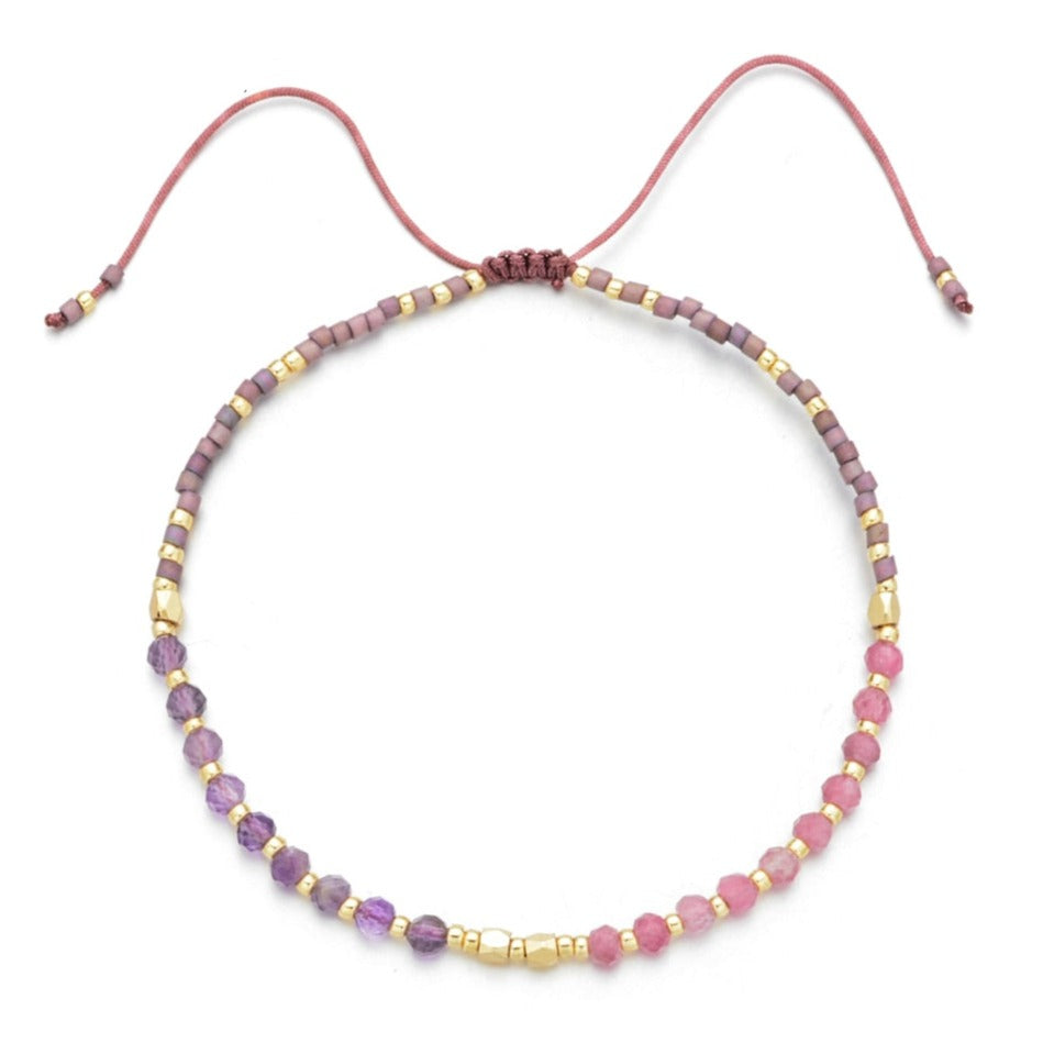 Fabulous! Our Cosmo bracelet is handmade with floral-colored beads and gold accents, secured with a light pink cord. For the ultimate look, pair Cosmo with our Stella bracelet.
