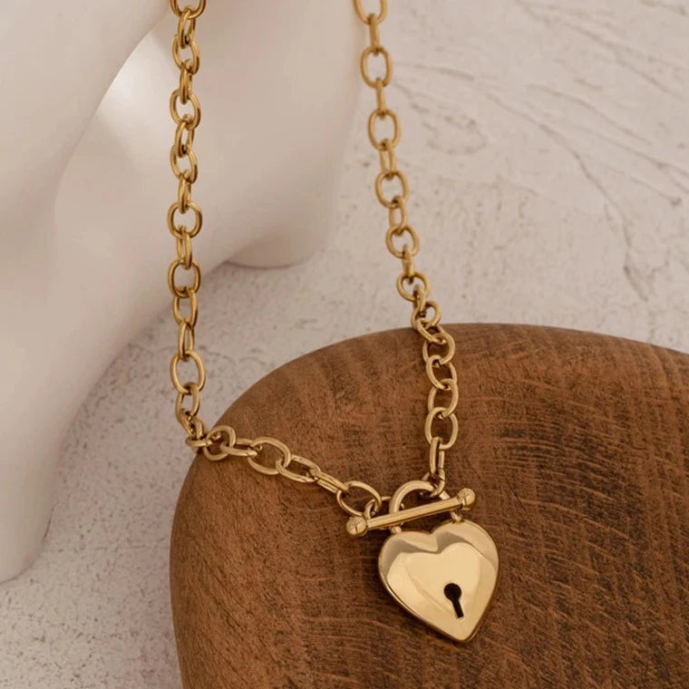 Meet our Katie Necklace - your new go-to fave for a chic, summer look. With its delicate gold plated heart lock pendant, this piece is made to add a touch of glam to your outfit! A must-have if your'e to give off an edgy look.